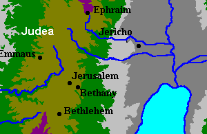 This map is of a very small part of the land of Israel. It provides a guide to the location of the places mentioned in the last week of Jesus' life. Jericho and Ephraim are included because Jesus made his way from a city called Ephraim via Jericho to Bethany on his way up to the Passover when he was crucified. Emmaus is the village to which the two were walking on the resurrection morning.